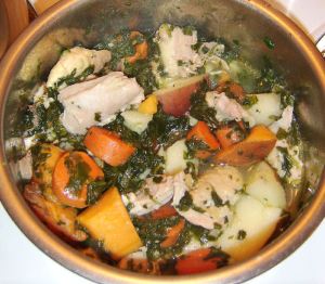 I snagged a package of about-to-go-off-so-on-markdown chicken thighs at the grocery store yesterday and this afternoon cooked them up. After the chicken got cooking, I tossed in some other foods I had on hand – carrots, sweet potatoes, new potatoes and spinach. Remove chicken bones post cooking, toss meat back in pot, let cool and voila – dog dinner!
