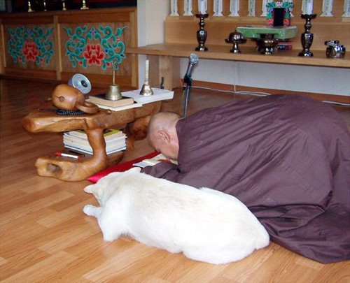 Image: Hama, a Jindo dog in Korea who learned to perform Buddhist prayer rituals alongside monks. The temple is home to dozens of stray dogs.