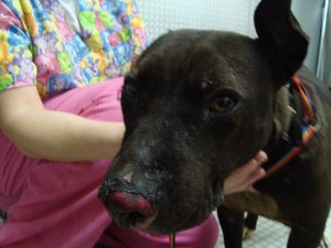 The Pit Bull was brought to BARCS [Baltimore Animal Rescue & Care Shelter]. Despite the severe pain she was in, she wagged her tail and looked for comfort from the BARCS staff members.