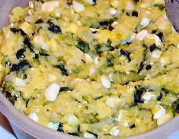 The first batch was a non-meat menu so I used a rice/squash/spinach base and added some chopped hard-boiled eggs and cottage cheese. I stirred in olive oil in the process.