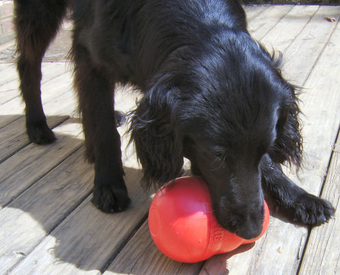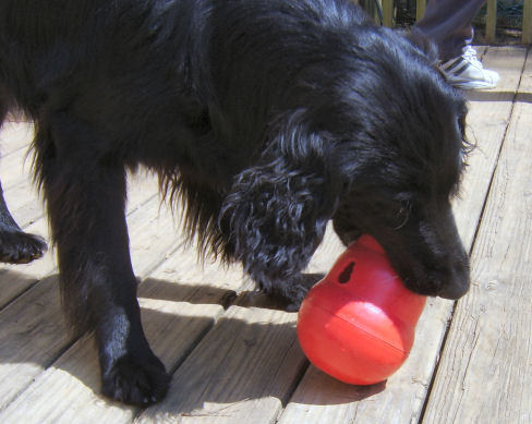 I’m glad I did. The Kong Wobbler is different from the regular Kong in that it’s weighted at the bottom and the hole for dispensing treats is much smaller and located on the side. It’s basically a treat-filled Weeble. I like that it’s not designed for instant reward but rather something to play with over time. For my dogs, this was an immense improvement and definitely generated some interest. I filled it with some of the salmon treats (Scroll down to IQ Treats) they included in the box and took a few photos of Patti and Graham interacting with the toy.