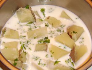 Lastly, dinner at our house last night was boiled potatoes (which I chunked after boiling), buttermilk, and minced greens (broccoli leaves, parsley and mint).  I sprinkled on some ground flaxseed before serving.  Also, I had handed out raw carrots as a snack while I was cooking which gave me 5 minutes of peace.