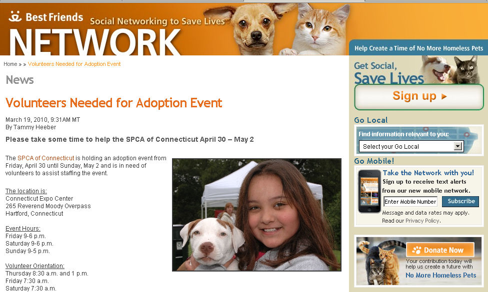 Best Friends posted this appeal for volunteers to assist in a large adoption event hosted by the SPCA of CT this spring.