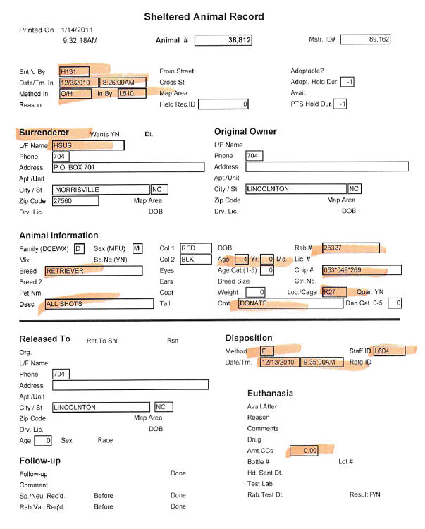 Jennie, LCAS records are available to the public as they are a taxpayer funded shelter. I put these on Google Docs last night. I have no idea when HSUS may or may not have seen them. No one at HSUS will speak to me but several of their staff are subscribed to this blog so perhaps if they hadn’t asked to look at the LCAS records before, they have seen them now, I don’t know.