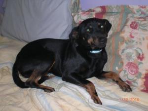 Imp is the last of a chow mix litter from the summer before last.  They had caught parvo, and a couple died.  Imp has what the vet calls “Blue Dog Syndrome” which is when dogs with blue coats have hair that is especially brittle, which causes the hair to break off, and the dog gets bald patches.   He has been in the program since June 2009.