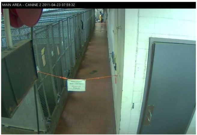 My suspicion, based on what I saw this morning myself and what Anonymous has reported seeing on the webcams, is that they are storing the dogs on the kill list somewhere that is not visible on the webcams and then sneaking them in via some path that is not visible on the webcams except for if the camera happens to snap a shot at the moment they hit the kill room door at the far end of the hallway. That’s what I’ve included in this post.