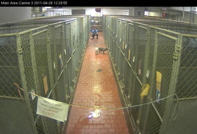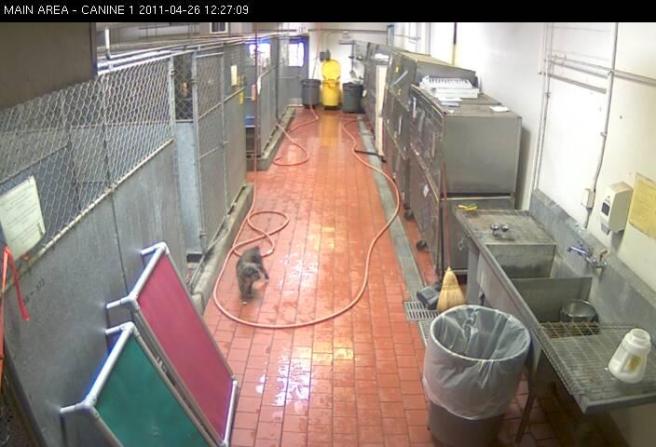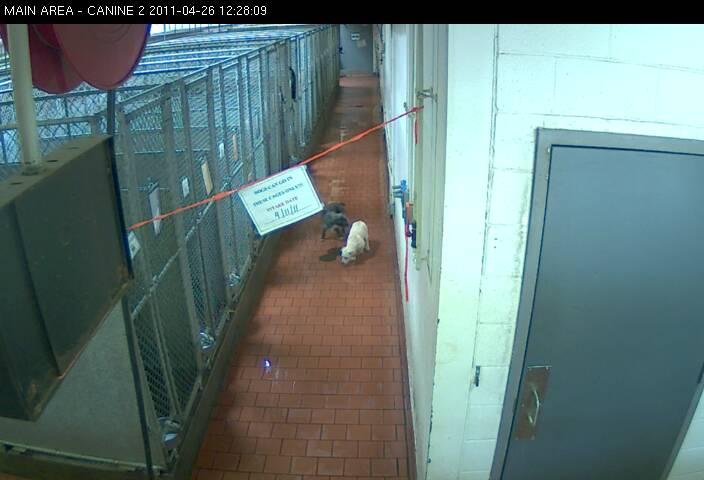 1. I doubt they would allow dogs to roam the shelter unsupervised. I figure the last shot is the beginning of the end for their tour of the facility as they are about to be caught.