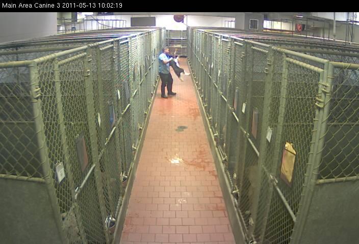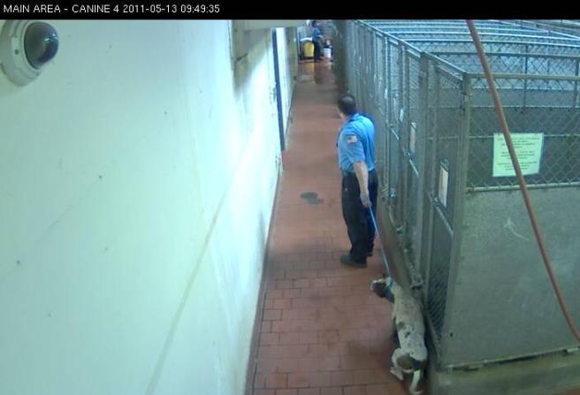 Scared stockdog type has to be moved to a new kennel.The worker ties him to a cage door and leaves him alone. The dog panics.Waiting, stressing.When the worker returns, the dog apparently needs some "help" getting into the kennel.