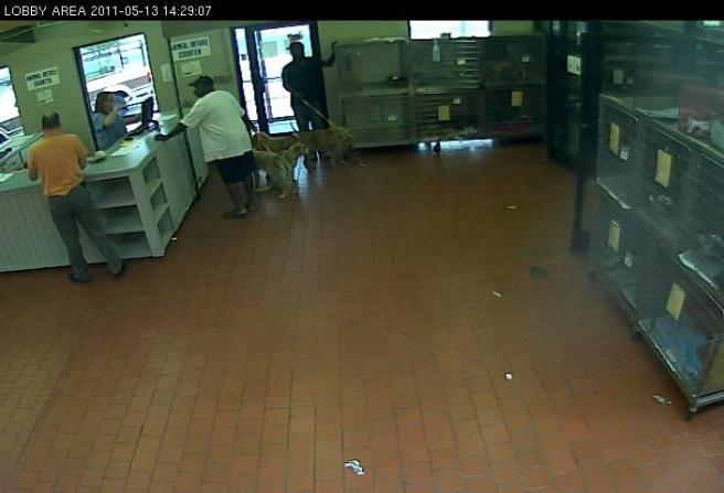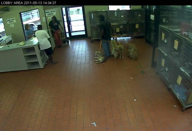 Two people bring in 4 gold dogs to the shelter.Matthew Pepper and a staff member look at the 4 dogs being surrendered.The dogs appear to be well mannered as they wait.First two gold dogs to the kill room.Big smile, coming back for the second two.This is the last shot of the dogs on their way to the kill room where they were presumably tied to the wall and forced to watch their canine buddies be killed before them.