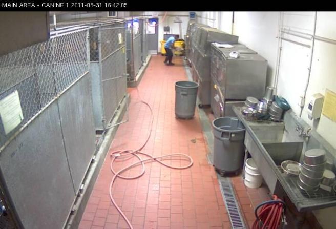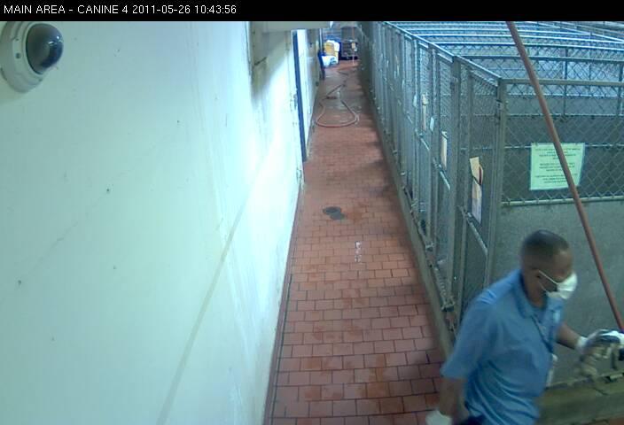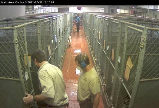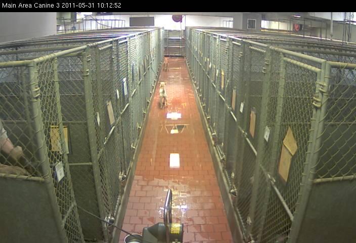 Two dogs are taken out their kennels and tied to the cage doors while the stopped up drains are being worked on.