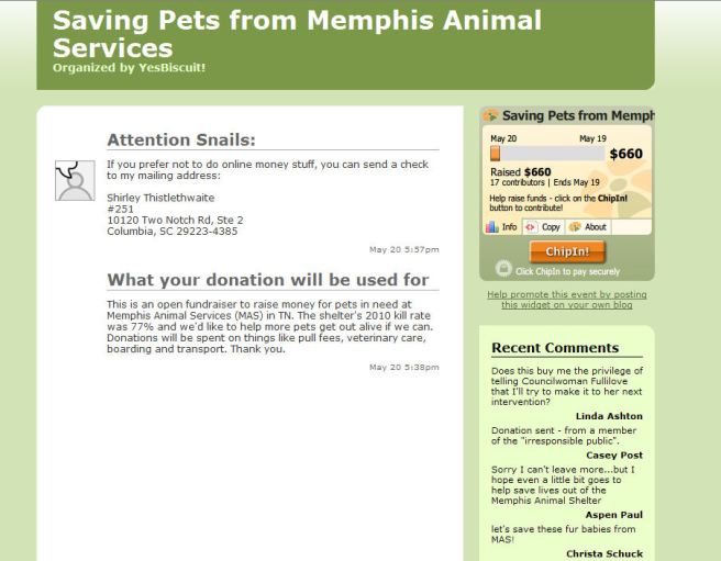 Make a donation to the new ChipIn to help pets in Memphis who have no city sponsored advocate. (I have already donated the $476.42 left from the previous ChipIn.) These funds will be used only when I contact Meows and BowWows and ask them to pay expenses for a specific pet in need that I have featured on the blog. There will still be complete transparency for readers as to how the funds are disbursed. For those who prefer to donate by mail, here is the address: