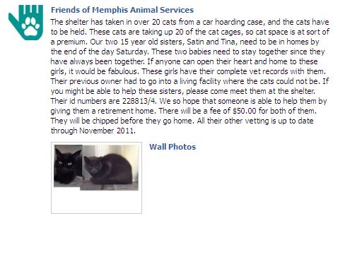 1. Hi, Maybe they could buy another cat cage? temporary as I’m sure some of the cats they just received will find homes faster if they are younger. I live in Nova Scotia Canada so can’t take the two sisters. But would be able to pay the fee if someone can adopt them down there. I feel for the person that had to give them up also, no doubt the human will fall sick of a broken heart. Shame.