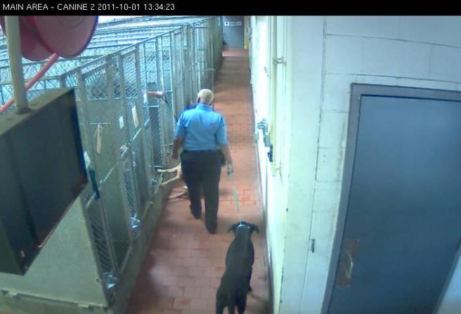 The city says the hours the ACOs are not out on calls each day are spent working at the pound. For now, taxpayers can view the ACOs “working”, as in the above cap, via the webcams. Soon though, the “working” (or “getting worked over”, if you look at it from the pet’s point of view) will not be visible to the public since the city is killing the webcams at the new building.