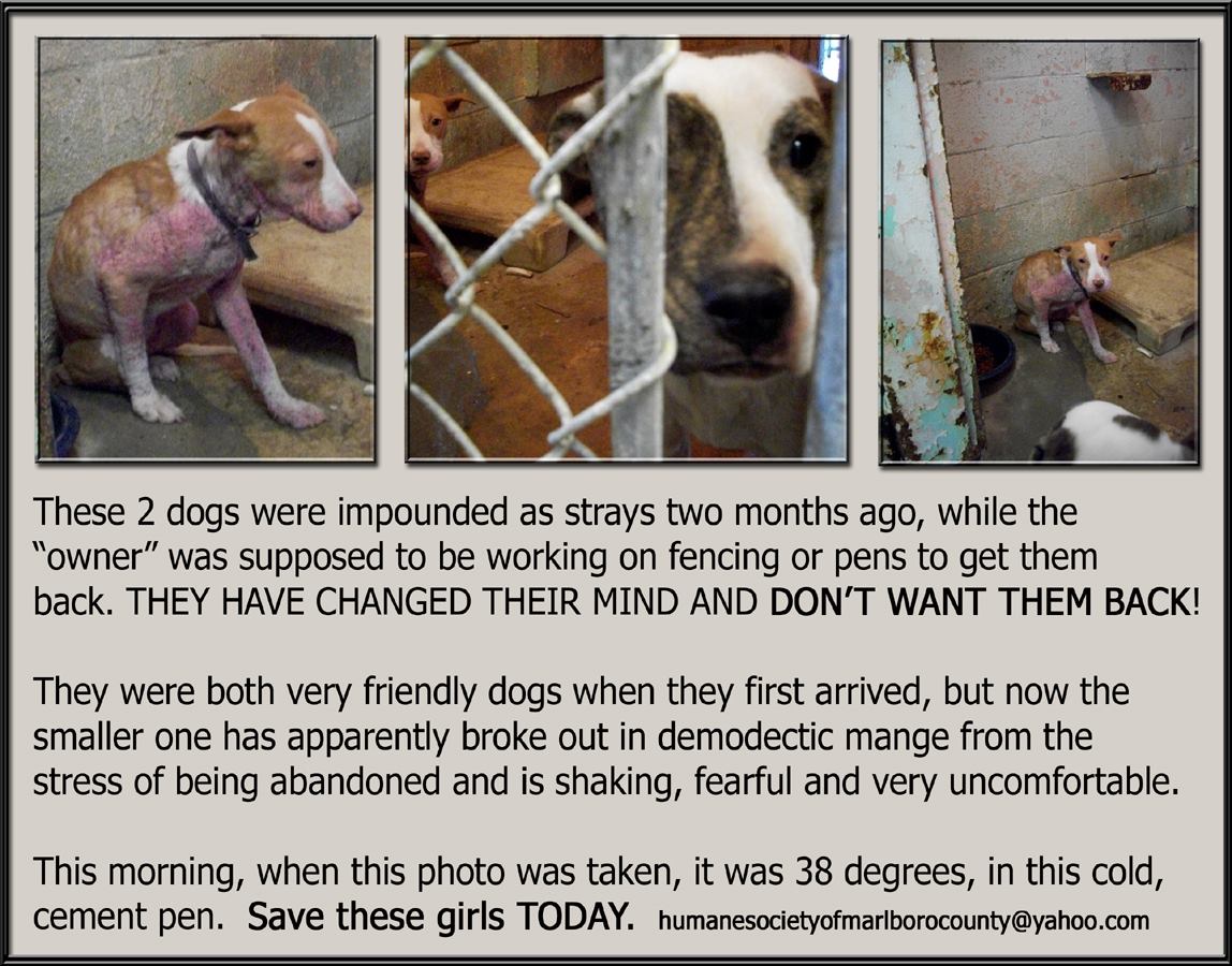 HOW is this allowed to happen?  The posting for these dogs talks about how they were betrayed by the owner.  It sounds to me like the owner left them in good condition and the pound turned one of the dogs into a shivering, suffering wreck.  The owner isn’t going to redeem the dogs.  That sucks.  But it happens.  That’s why we have shelters.  That’s why the Marlboro Co pound is there.  Remind me again who I’m supposed to be angry with here?