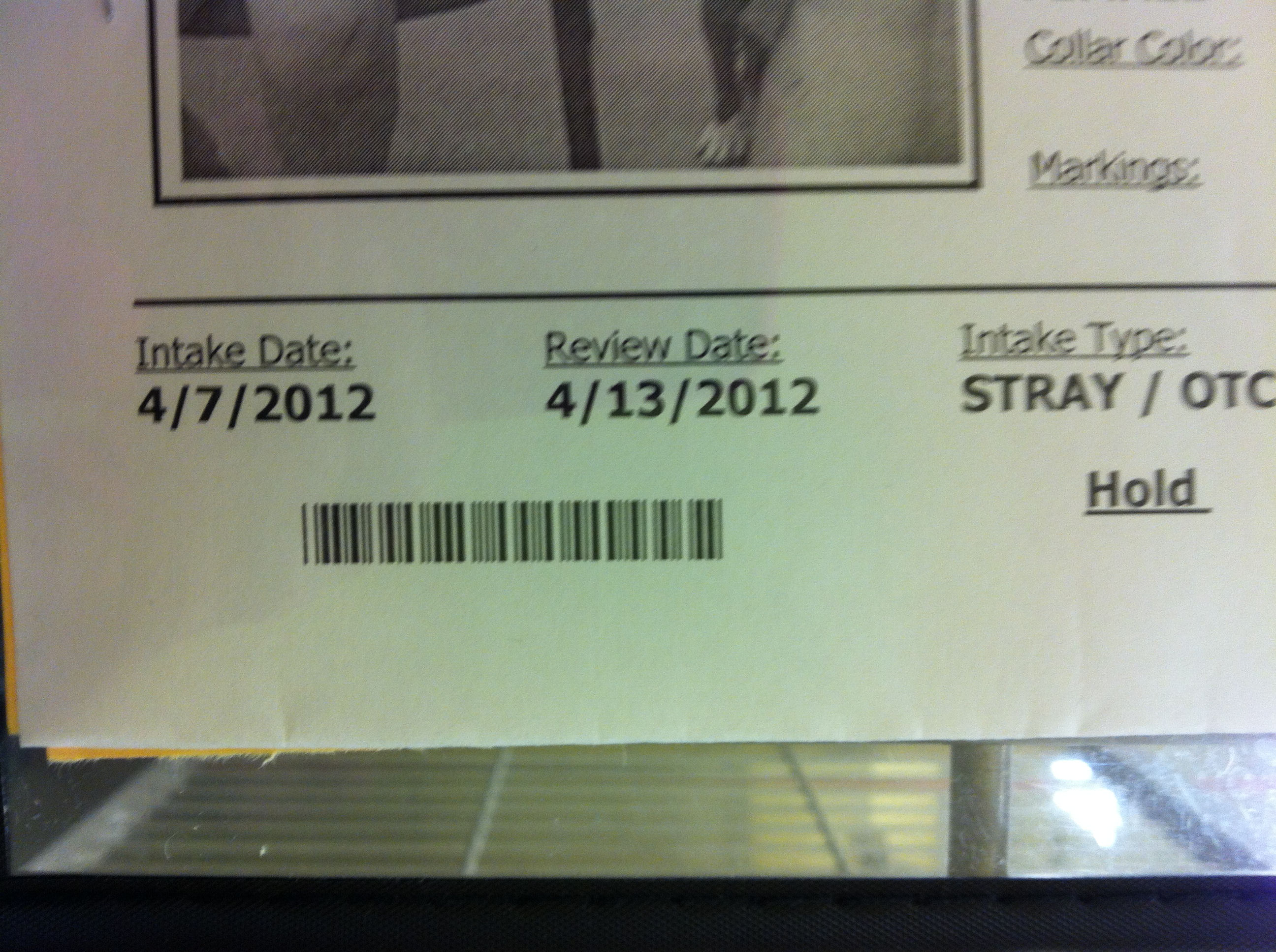Added: I’m adding a photo of the portion of this dog’s kennel card which shows that her intake type is listed as “Stray/OTC”.