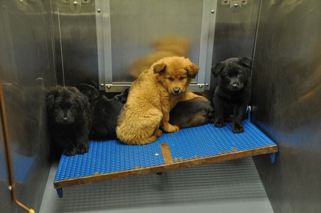 I believe these are the Labrador Retriever/Chow Chow mix puppies that are on Pet Harbor, numbers A23957-58-59-69-61; three females and two males. I “think” that they forgot to count a puppy or a puppy died. It looked to me like there were three puppies in one cage, one by herself, and two together. At any rate, it looks like those little guys are not doing so well in that kennel with a broken down platform to sleep on.