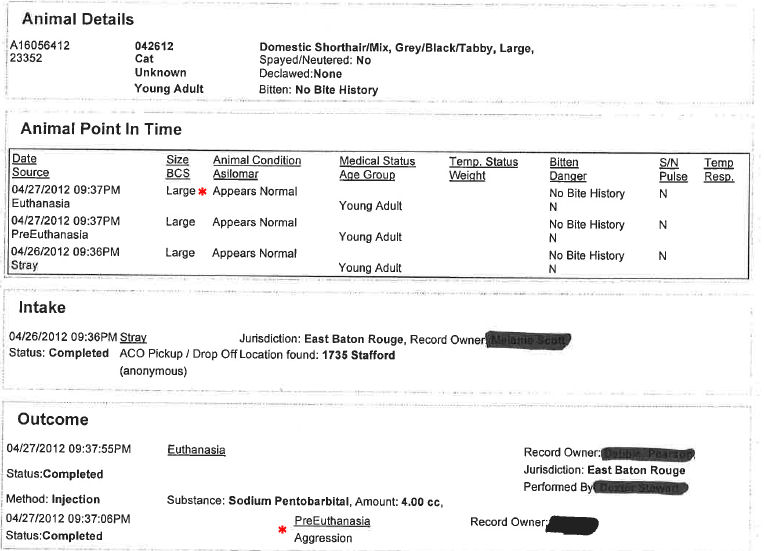 The records for cat #23352 indicate he was killed on April 27, 2012 for “aggression” while noting his condition as “appears normal”. (I starred both notes for clarity.)