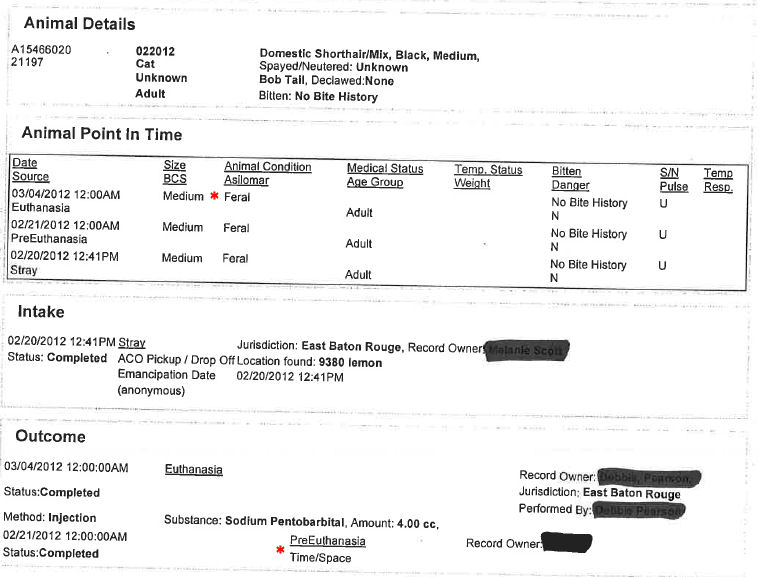 If you look closely, you can see that the blacked out name on Intake for these is Melanie Scott. The blacked out name in the Outcome section is Debbie Pearson (near as I can read).