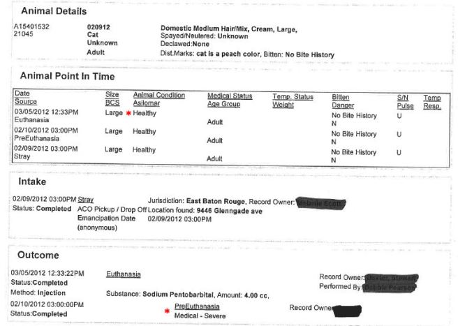As with Angel, there appears to be a discrepancy in the records for Peaches regarding the pre-euthanasia reason (medical – severe) and the euthanasia condition (healthy). I starred the discrepancy in the portion of the records pictured below. There are no notes of any kind in Peaches’ records indicating she was ever sick at CAA.