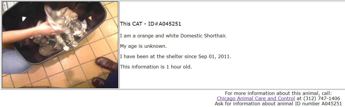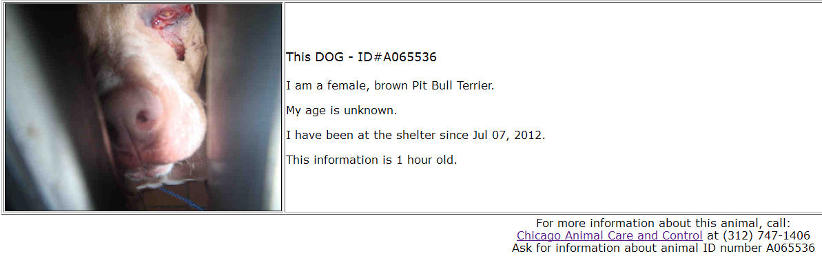 There is a link on Chicago ACC’s webpage for shelter data but it’s broken.  If anyone has recent stats on this facility, please post a comment.  It would be interesting to see how this troubled pound has fared since the former director, who reportedly made significant improvements, was fired in March.  The pound’s PetHarbor listings are depressing, at best and horrifying, at worst.  I don’t know what other types of marketing Chicago ACC does to get pets adopted but hopefully it’s way better than what it manages to put on PetHarbor.