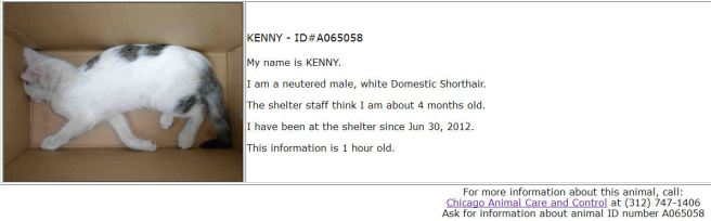 And I just looked through Friends of Chicago Animal Care and Control’s PetFinder listings and Kenny is not there. So the photo of him looking dead in a box is all that anyone searching online will ever see. Again, less than wonderful marketing.