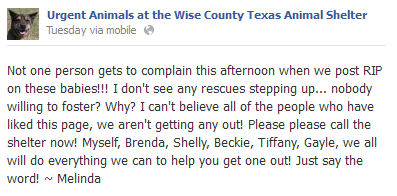 We set up a FB page which we use to berate you worthless people while we threaten to kill pets so damn – why isn’t everyone at the shelter right now for some in-person abuse adopting?