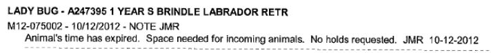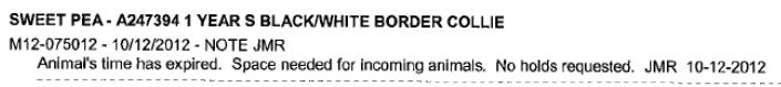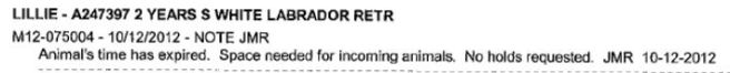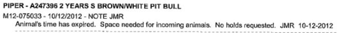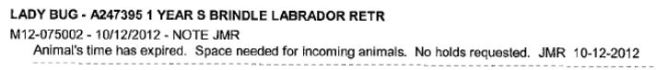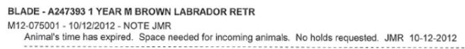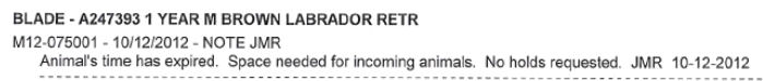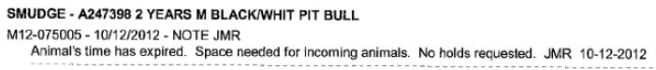 The following dogs were surrendered to MAS by court order on October 11, 2012: Blade, Sweet Pea, Lady Bug, Piper, Lillie and Smudge. If you look at the notes on their cage cards, several of them were already neutered and there are notations that include “sweet dog”, “housebroken” and “leash trained”. Though one of the dogs was 10 years old, the rest were all 1 – 2 years of age. I look at these dogs and I see highly adoptable pets. MAS interim director James M. Rogers looked at them (on paper, at least) and ordered every single one of them be immediately killed.