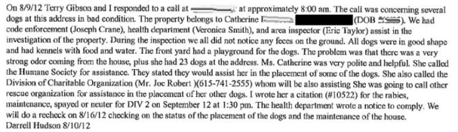 In August 2012, the city of Memphis sent representatives from every conceivable division to the home of a dog rescuer who had a couple dozen dogs on her property. These are the initial notes with some personal info redacted (click to enlarge image):