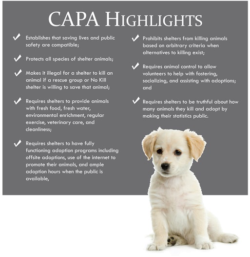 CAPA lays out a number of important requirements for public and private shelters that include lifesaving, transparency and community participation. Specifically, neither public nor private shelter directors would have the discretion to kill pets under CAPA without giving public notice nor would they be allowed to kill pets that a rescue is willing to take.