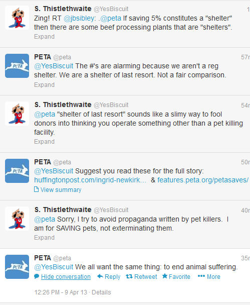 This is hilarious to me, and extremely sad, frustrating, and infuriating. I thought “we all want the same thing” was a paraphrase, cliche or simplification of what these groups say; but for PETA to use that actual phrase only emphasizes how stupid, ignorant, and out of touch with everyone they are.