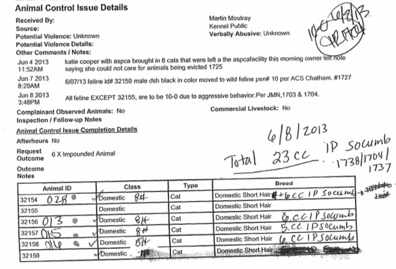 Here are the records for the five cats I obtained via FOIA request from the Gwinnett Co pound (click to enlarge):