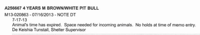 I love the “no holds requested” thing that they put on nearly every animal. It’s as if they’ve been marketing this animal far and wide, doing their very best to get it out alive, but because no one was willing to take the dog, they were “forced” to kill him. Does it make Tunstall feel better to write that in? A little self-deception to soothe a guilty conscience?