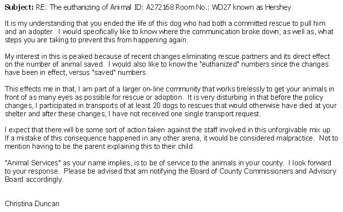 Florida – After Orange County Animal Services oops-killed a 2 year old dog named Hershey who had an adopter waiting to take him home, the facility’s spokesman refused to disclose exactly how the communication breakdown occurred. Local rescuer Christina Duncan didn’t accept the brush-off and contacted several individuals in positions of leadership at the pound to demand answers. Here is the e-mail she wrote to the pound’s vet, Robert Ridgway (click to enlarge):