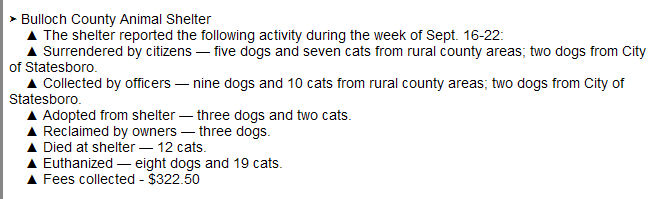 Georgia – The Bulloch Co pound’s webpage is on the county government website. It indicates the shelter is closed on weekends and describes what appears to be a limited admission status. The local paper, the Statesboro Herald, publishes weekly reports detailing the number of animals handled at the facility. I previously wrote about a 3 week period in Bulloch Co from August 26 – September 15, 2013. Here are the reports in the weeks since that post: