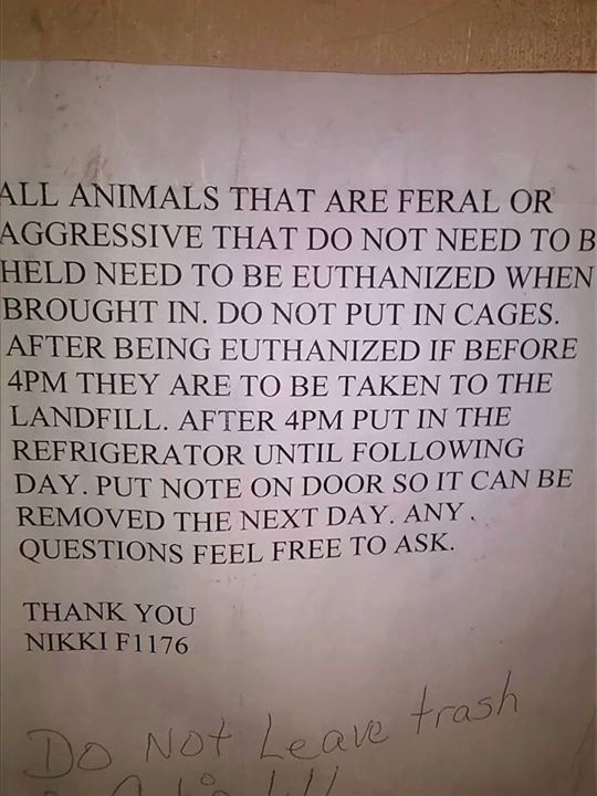 We so often hear from killing apologists that “Nobody wants to kill animals.” Since it is impossible to accurately assess temperament in ANY dog or cat upon impound at a shelter, the sign at top is instructing pound employees to ignore standard protocols, pretend to assess all animals upon impound and then, based upon the false assessment, kill all “feral” and “aggressive” animals whom the state does not mandate be held. And their “Friends” blame the public for the killing – the very people they demand rescue, donate and adopt from the shelter.