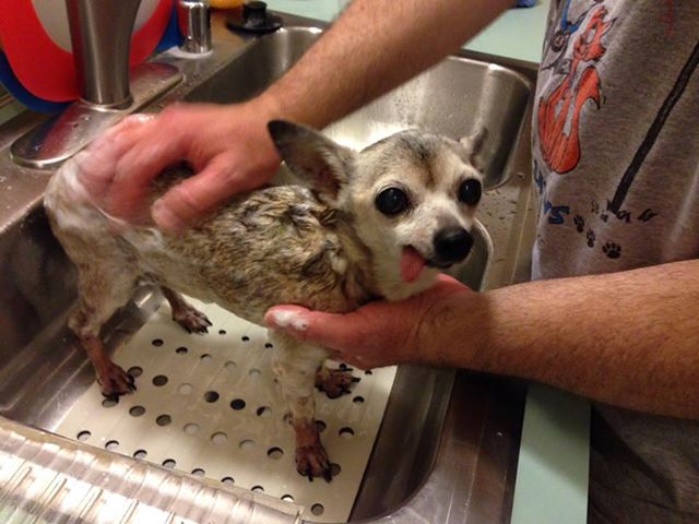This is Mallymkin getting her first bath at her new home about two weeks ago. She was seized, along with a pit bull puppy, from a bad situation by animal control. The puppy was adopted, but Mally languished in the shelter. Twelve years old, toothless, plagued with skin problems, her prospects were not good. But when my husband, Frank, and I saw her photo on Facebook, we fell for her and fell hard. We went to the shelter and adopted her the next day. – Denise Mulliken