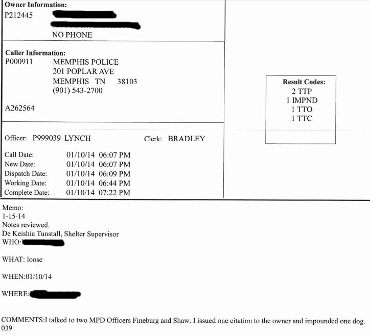 On January 10, Memphis Animal Services responded to a police department request for assistance with a loose dog.  The ACO knew who the owner was and apparently spoke with him/her.  The owner advised that the residence had no phone.  MAS issued a citation to the owner and impounded the dog.