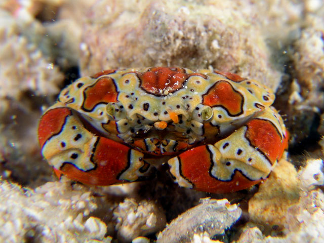 Ooo, you’ve found one I don’t know! Definitely a crab, and wow, what amazing color – definitely a reef animal too, maybe tends to hang around anemones or sponges?
