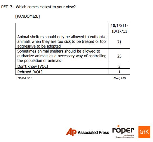 The overwhelming majority of the public, 71% of those surveyed, believes shelters should only be allowed to euthanize animals who are medically or behaviorally hopeless.  Sorry to rain on your Pet Killing Parade with my Actual Data from Reputable Agencies but oh, not sorry.