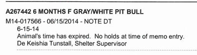 On June 15, an MAS supervisor noted that no one had placed a hold on the dog who had remained hidden from the public since impound. And despite the fact that her owner still had 2 days to claim her, the supervisor noted the dog’s time had expired which appears to be a violation of the stray holding period law.