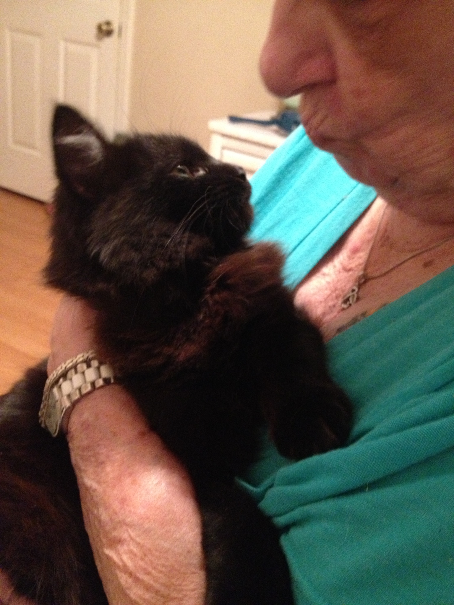 “My grandmother Frances in Memphis, TN greeting her FIV+ foster Rockette saved from “the list” at Memphis Animal Services.” (Photo submitted by Angie W.)