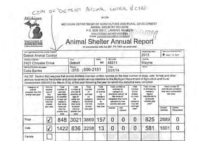 Screengrab from the Michigan Department of Agriculture’s website showing the Detroit pound’s 2013 report.