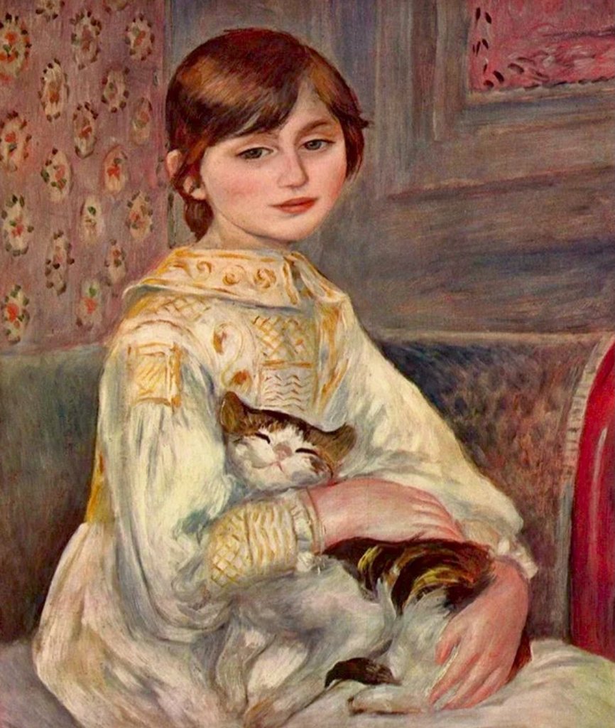 Tea in the Garden by Henri Matisse, 1919Greek mug, 4th century BCELittle Girl in a Blue Armchair by Mary Cassatt, 1878Portrait of a Young Lady Holding a Cat by Francesco Ubertini (called Bacchiacca), circa 1525Woman Lying on a Bench by Carl Larsson, 1913Along the Cliff by Stephanie LambournePortrait of Julie Manet or Little Girl with Cat by Pierre-Auguste Renoir, 1887A statue of a merchant and cat in Rostov-on-Don, Russia by Dmitry Lyndin, 2006Four pages featuring dogs and a cat from the book Icones Animalium by Conrad Gessner, 1560