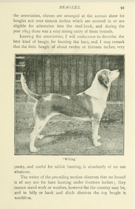 Illustration which includes a rough-coated beagle by Arthur Wardle from the book A history and description of the modern dogs of Great Britain and Ireland: sporting division by Rawdon Briggs Lee, 1897Illustration of Kerry beagles, a significantly larger dog than the regular beagle and often with black and tan coats, by Arthur Wardle from the book A history and description of the modern dogs of Great Britain and Ireland: sporting division by Rawdon Briggs Lee, 1897Two book excerpts featuring beagles from Biggle Pet Book by Jacob Biggle, 1900Above photos from the book Beagles and Beagling by Albert Frederick Hochwalt, 1923Page from the book The Trinity Foot Beagles by F. Claude Kempson, 1912Page from the book Hare-Hunting and Harriers: with notices of beagles and basset hounds by Henry Anderson Bryden, 1903Illustration from the book The Sporting Dog by Joseph Alexander Graham, 1904Two pages from the book The hunting field with horse and hound in America, the British Isles and France by Frank Sherman Peer, 1910. Foot beagles are dogs who are hunted without horse or gun.More foot beagles from the book Hunting by John Otho Paget, 1900A strong opinion in the text on the page with this photo from the book Hunting by Henry Charles FitzRoy Somerset Beaufort et al, 1906A fuzzy photo of a cute dog from the book The American hunting dog: modern strains of bird dogs and hounds, and their field training by Warren Hastings Miller, 1919