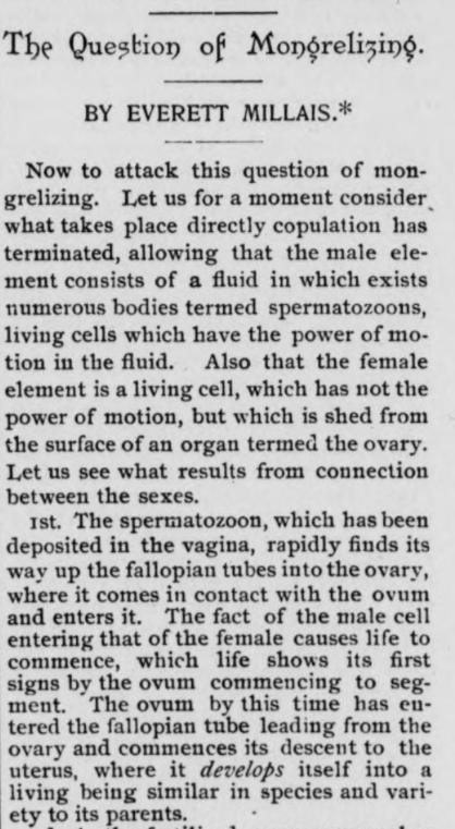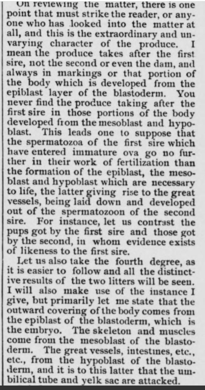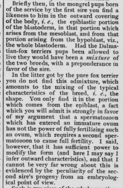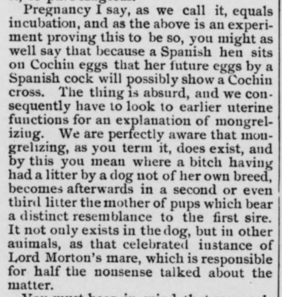 While I assume this “mongrelization” myth is substantially less common today than it was around the turn of the twentieth century, there was skepticism, even then. I was surprised to read this 1891 article in the trade paper The Fanciers’ Journal attempting to simultaneously debunk and scientifically explain how “mongrelization” happens. The science offered is wrong in regard to the main subject but I found it a fascinating read and offer it here for its historical value and a reminder that science is an evolving field.