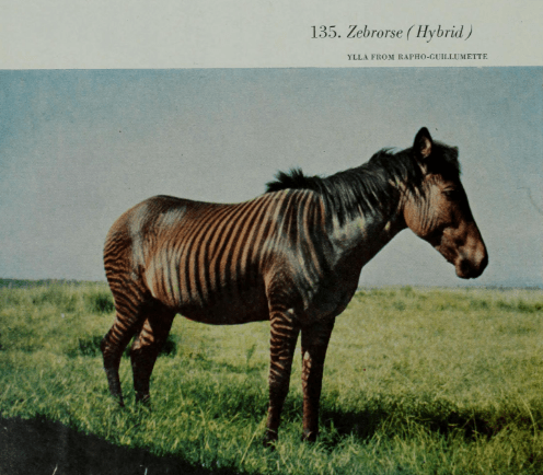 From the book Living Mammals of the World in Color by Ivan T. Sanderson, 1955From an article by Abraham Dee Bartlett appearing in Proceedings of the Zoological Society of London, 1884From the book The Breeding of Animals by Frederick Blackmar Mumford, 1917Photo by F. W. Bond appearing in the July 12, 1924 edition of Illustrated London NewsPage from The Book of the Animal Kingdom by William Percival Westell, 1910From an article on naturally occurring pike-pickerel hybrids appearing in the November 1920 issue of Forest and StreamFrom the book Wild Animals in and out of the Zoo by William M. Mann, 1930