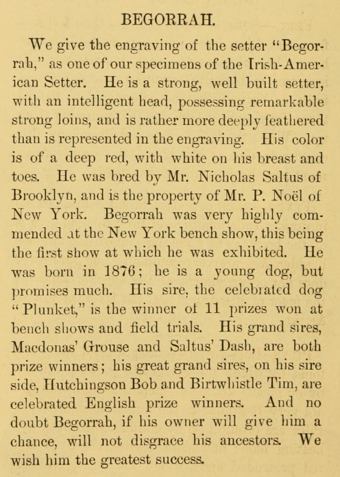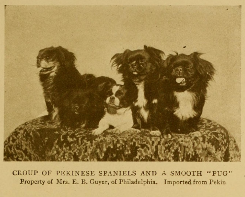 Two pages from the book Hounds by Frank Townend Barton, 1913An Irish-American setter from the book Breeding, training, management, diseases & c. of dogs by Francis Butler, 1877An entry in the retriever section from The New Book of the Dog, Vol. I by Robert Leighton, 1907From The Illustrated Book of the Dog by Vero Kemball Shaw, 1881Pekingese mixed with pugs (first three images) and with Japanese spaniels (fourth image) from The Dog Book, Volume II by James Watson, 1906