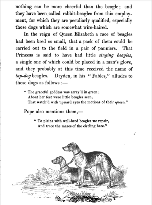 The entry on the beagle is rather short. The first illustration was engraved by T. Giles and painted by W. R. Smith and the second was engraved by E. Landells and painted by C. D. Radcliffe.