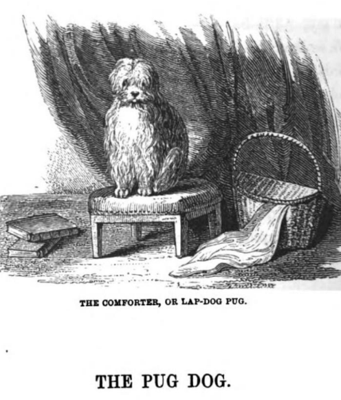 This is obviously not the dog that was commonly being exhibited in shows as the pug just a couple decades after this book. But I am fond of the moniker “the comforter” for a small dog.