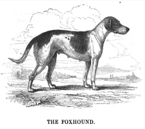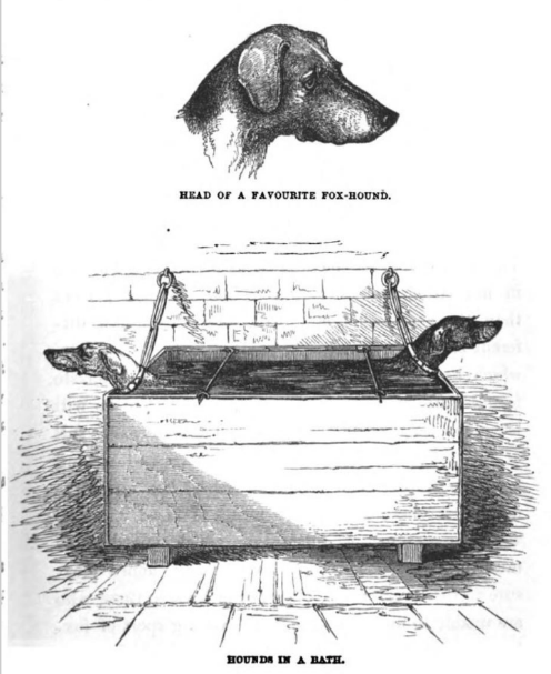 The beagles depicted appear to be much taller than the beagle that would be described in the breed standard before the end of the century but then size was always the personal preference of the huntsman. The dog in the foreground has been branded, a common practice for hunting dogs of the era.